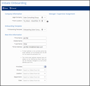 On this screen, complete the basic information for the new employee. Required fields are marked with an asterisk. When entering this information, you must use an active email address for the employee. If it is not active, the email address will be blocked in iSolved until your payroll specialist submits a request to remove it from the blocked list. If you use a company email address, check with your IT department to ensure the account is active before assigning it to an employee in iSolved.