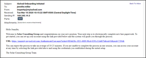 The new hire will receive an email with instructions for accessing iSolved to complete the Onboarding Wizard.