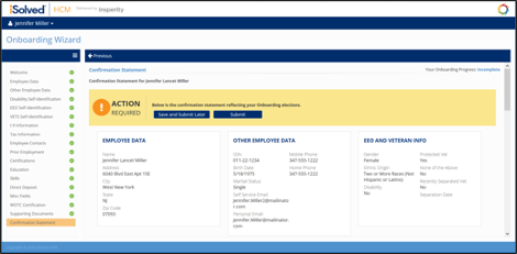 Once the employee has completed their iSolved account registration, the Onboarding Wizard walks them step-by-step through collecting information needed for new employees. Work with your payroll specialist to customize which fields are included by defining Onboarding Templates. You can require completion of certain fields or require access to certain sections. Information you can include: