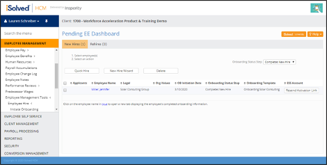Those users then access the Pending EE Dashboard to complete the hire either through Quick Hire or the New Hire Wizard. Information provided by the employee will be populated and can be reviewed and corrected, if necessary. The administrative user will then complete any remaining fields, including the employee’s salary information and job assignment.
