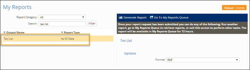 Then, go to Reporting > My Reports and run the Tax List report.