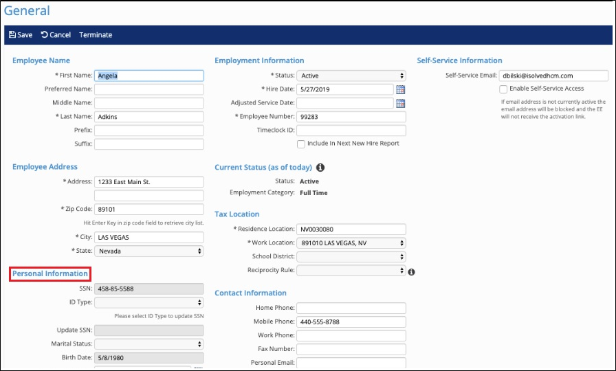 - Client administrators with access to the employee General screen can view the fields outlined in red below, which were previously located on the Employee Management > Employee Maintenance > Personal screen: