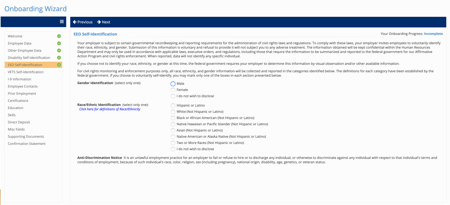 These changes support compliance with voluntary reporting standards for gender, ethnicity, disability, and veteran status. When employees complete these screens during onboarding, an electronically signed version is automatically saved in their Employee Documents. The information is also available on the Federal Reporting Data screen once you hire the employee.