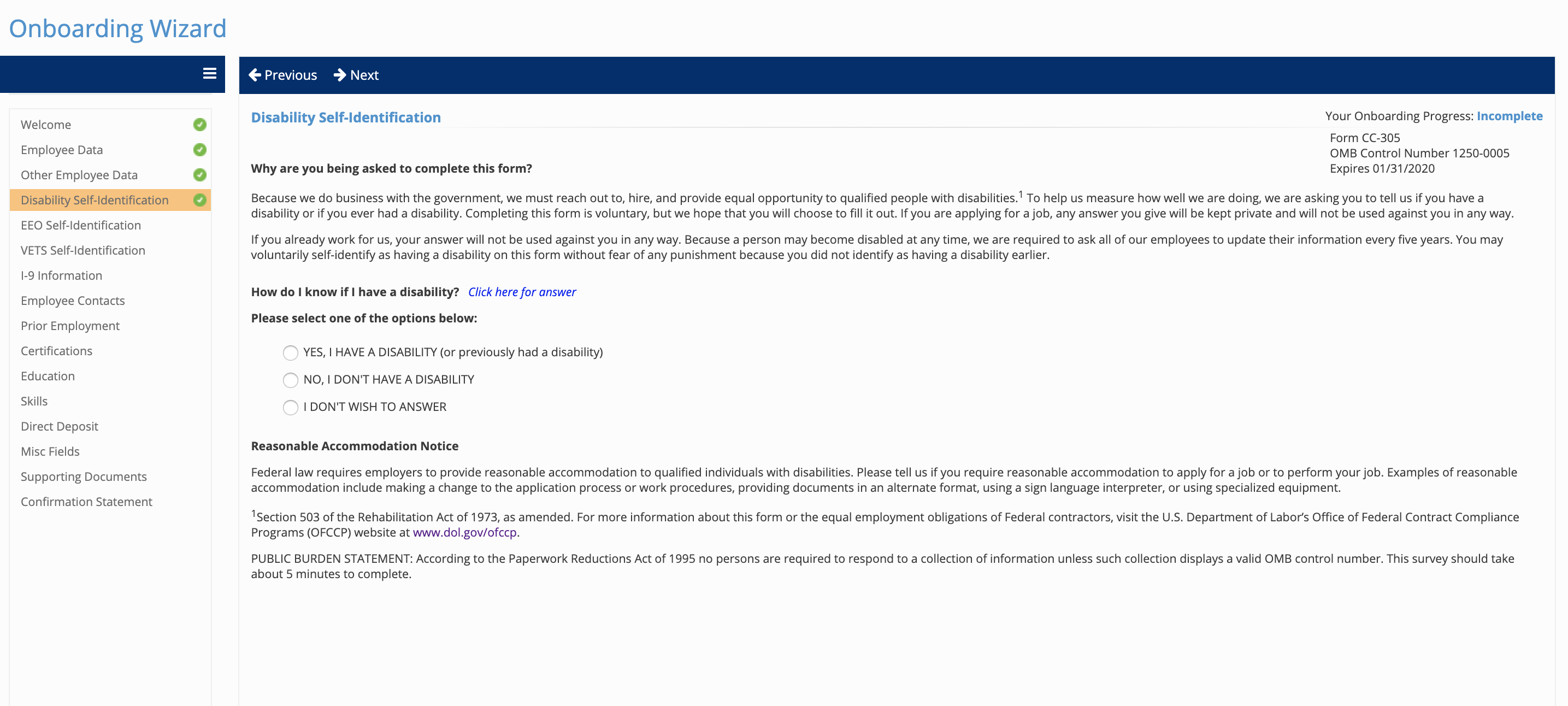 - Disability Self-Identification mirrors the Department of Labor form CC-305 – Voluntary Self-Identification of Disability.
