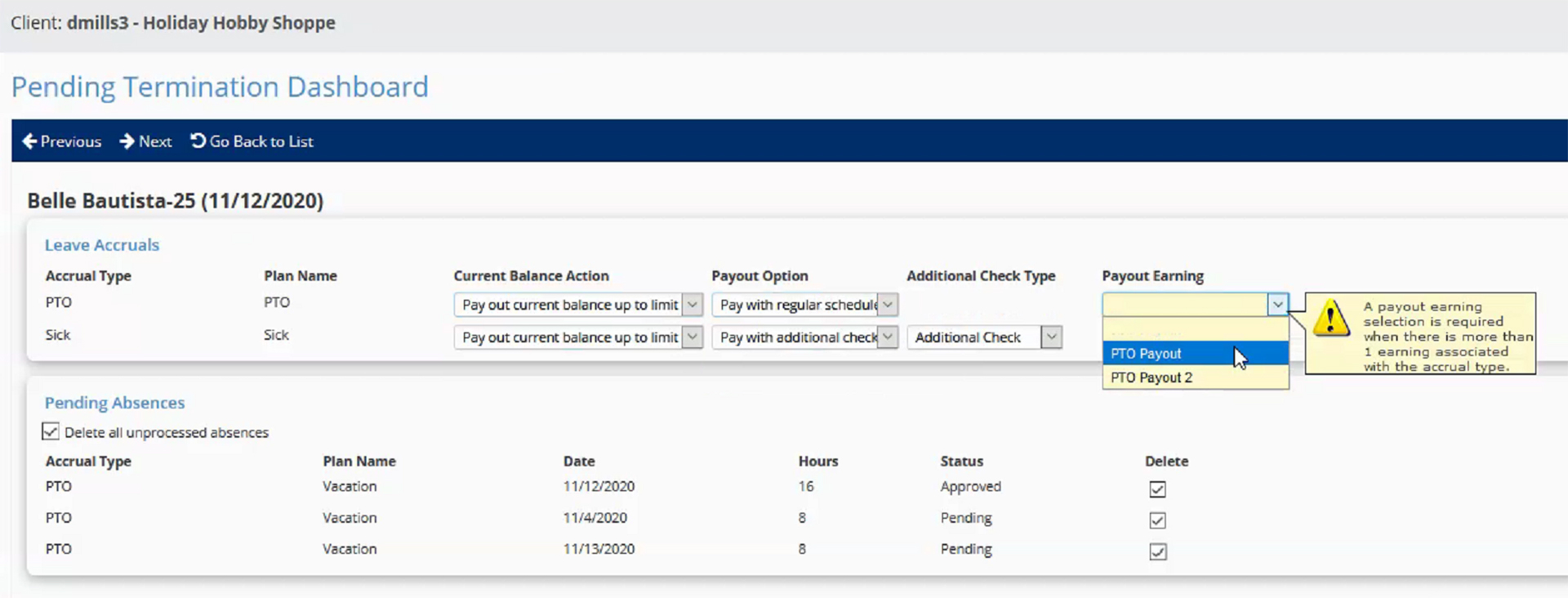 With this release, the option to payout unused time off balances can be automated through the Offboarding Wizard. Your Leave Accruals will need to be updated by your time or payroll specialist in order to allow this option to be available during offboarding.