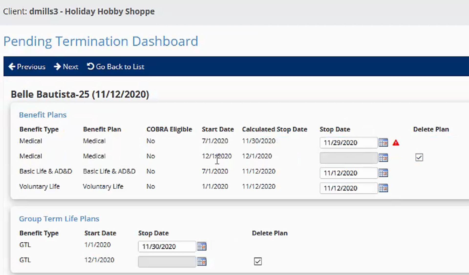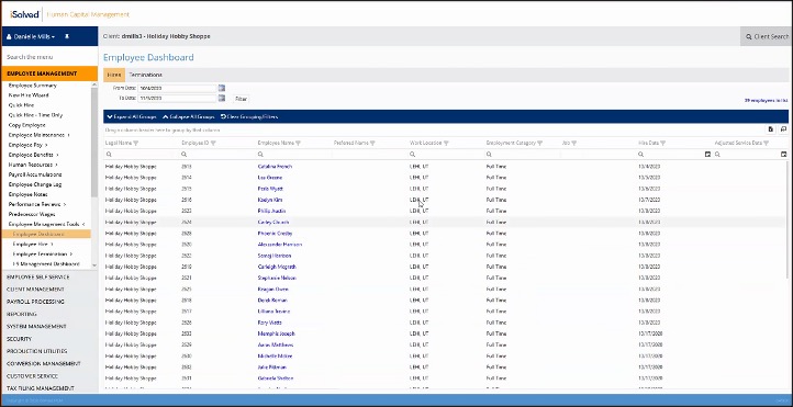 The Terminations tab displays employees whose termination dates fall within the range you specify. This dashboard will display multiple employment periods if employees have multiple termination dates within the date range. The employee name provides a shortcut to the employee’s General screen to easily access additional information or make changes. The columns on the dashboard can also be customized, sorted, filtered, and grouped to display the information that you need to review.